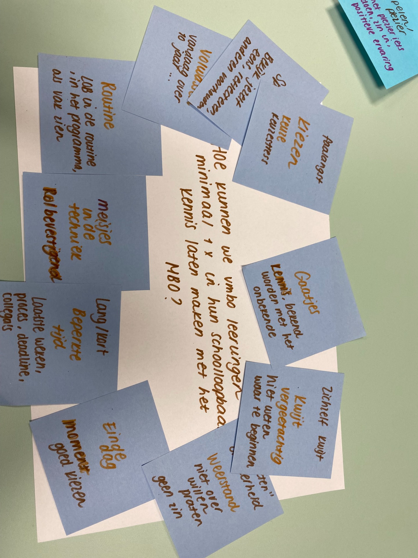 Het doel van deze ochtend was om samen met decanen van andere scholen in de omgeving tot een idee/ oplossing te komen voor deze vraag. Deze ochtend werd gehouden door een expert op het gebied van creatief denken op een school. Ze liet ons creatieve brein aanwakker, waarmee we deze ochtend aan de gang gingen met de design thinking methode. Dit moment heeft mij veel gebracht, doordat het goed aansloot bij de interventie waar ik op dit moment mee bezig ben. Er kwamen ideeën naar voren die ook goed aansloten bij mijn ideeën voor mijn interventie.