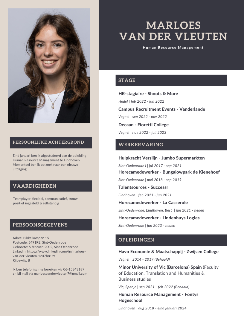 Hoera! Nu eindelijk bijna afgestudeerd! Na een half jaar studievertraging mag ik van trots spreken dat ik mijn diploma Human Resource Managent zo goed als in de pocket heb. Mijn scriptie heb ik succesvol weten af te ronden met een 8 als eindcijfer, waar iik ontzettend trots op ben. Momenteel leven we in een krappe arbeidsmarkt waardoor er meer openstaande vacatures zijn dan mensen. Dit maakt dat er voor ons als net-afgestudeerden een ruim aanbod is aan banen. Bij het Fioretti College heb ik het heel erg naar mijn zin gehad. Zowel van mijn kant, als van de decanen, collega's en directie is er een positieve samenwerking ervaren. Helaas is er wegens overbezetting op de uren van het decanaat geen mogelijkheid om op dit moment iemand aan te nemen. Naar verwachting zal ik 1 tot 2 jaar moeten wachten voordat er uren vrij komen in verband met het pensioen van een decaan. Hier kan ik helaas niet op wachten waardoor ik verder ben gaan kijken. Een onderwijsinstelling beviel me zo goed waardoor ik nagedacht heb over de Kopopleiding in Tilburg om me om te laten scholen tot docent in 2 jaar. Toch heb ik uiteindelijk de keuze gemaakt om me verder te gaan verdiepen in de wereld van HR. Ik wil eerste ervaring opdoen binnen het HR-werkveld, voordat ik van start ga met iets nieuws. Ik heb niet voor niets 4 jaar de opleiding HRM gedaan, waardoor ik wil gaan ontdekken welke organisatie en binnen welke branche het beste bij me past. Momenteel ben ik dus ook aan solliciteren op verschillende HR-functies.