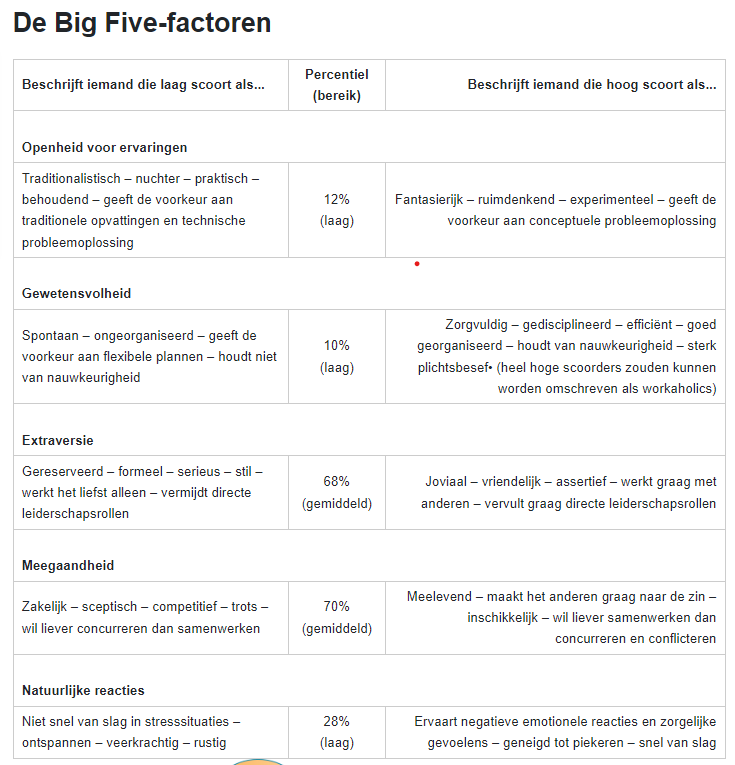 Openheid voor ervaringen: Traditioneel, nuchter, praktisch, behoudend, geeft de voorkeur aan traditionele opvattingen en technische probleemoplossingen